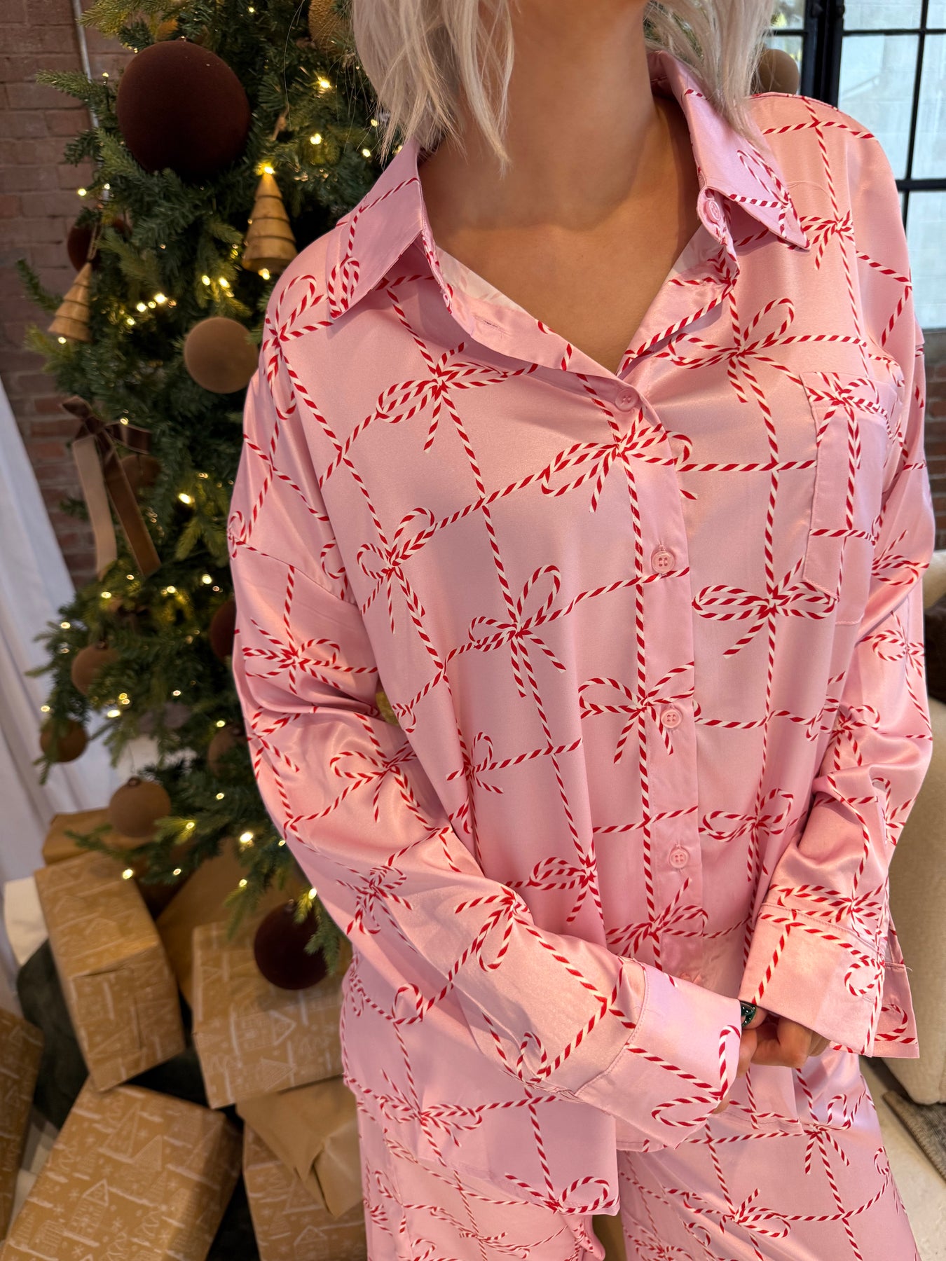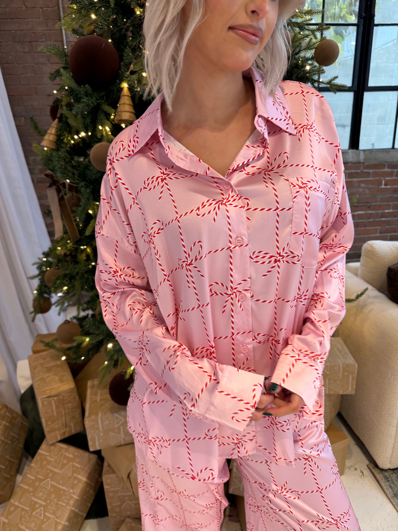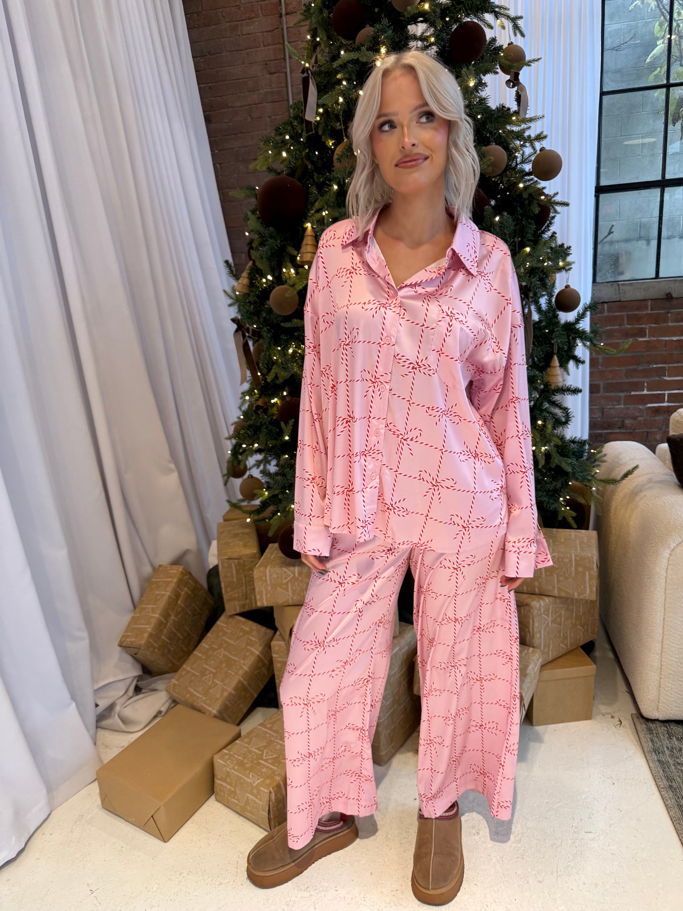 Sweet dreams and holiday magic await in the Candy Cane Lane PJ Set. Crafted from silky satin fabric that feels luxuriously smooth against the skin, this pink pajama set features an allover red candy cane print that’s festive yet chic. The relaxed button-down top and wide-leg pants create an effortlessly cozy silhouette — perfect for Christmas morning, movie marathons, or matching with your besties for holiday photos.