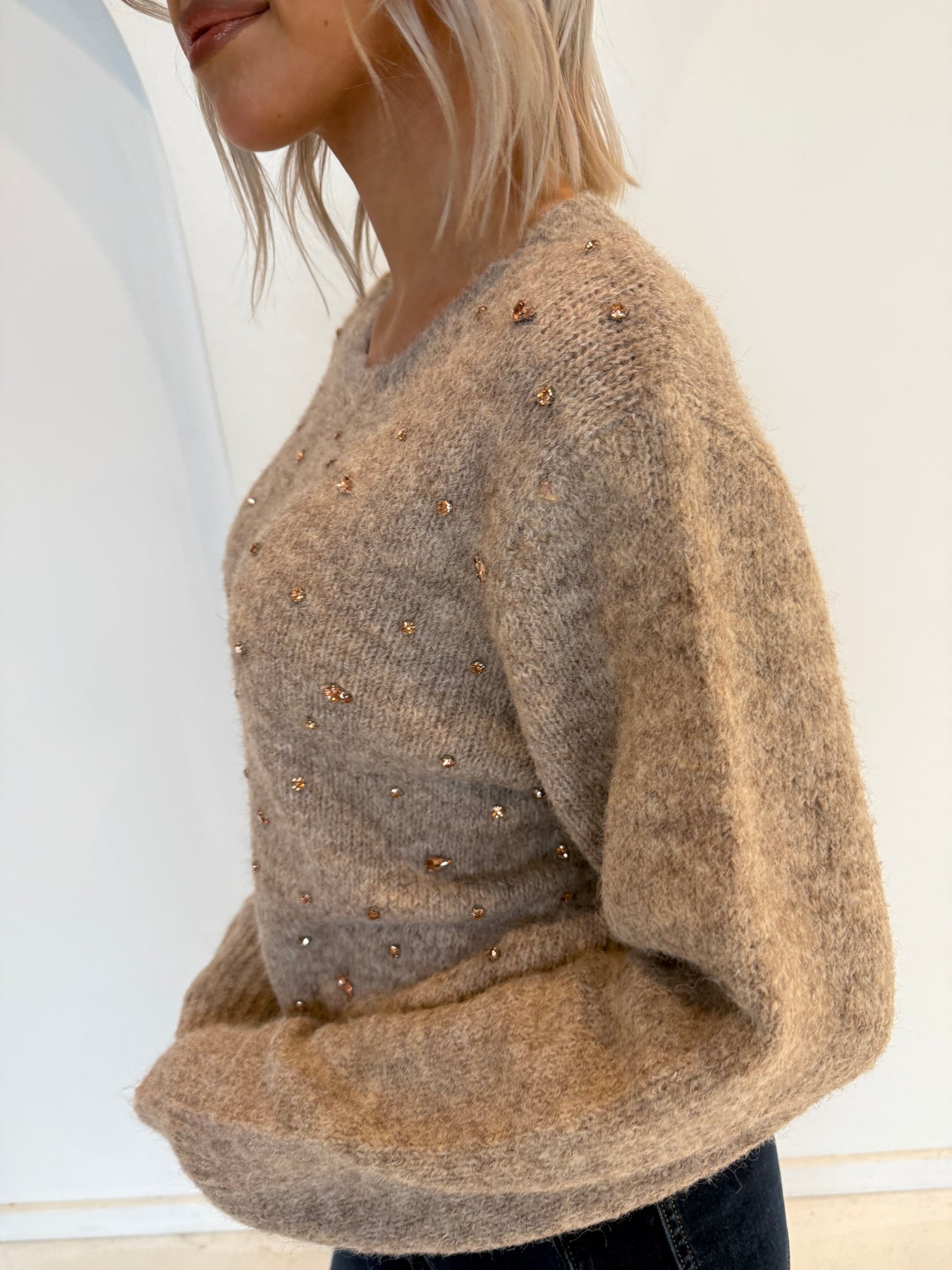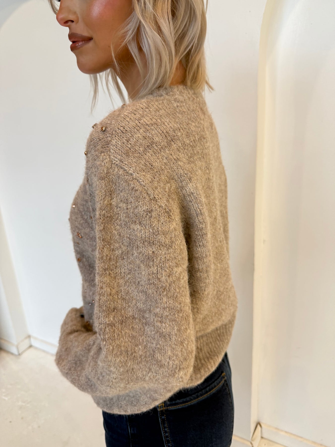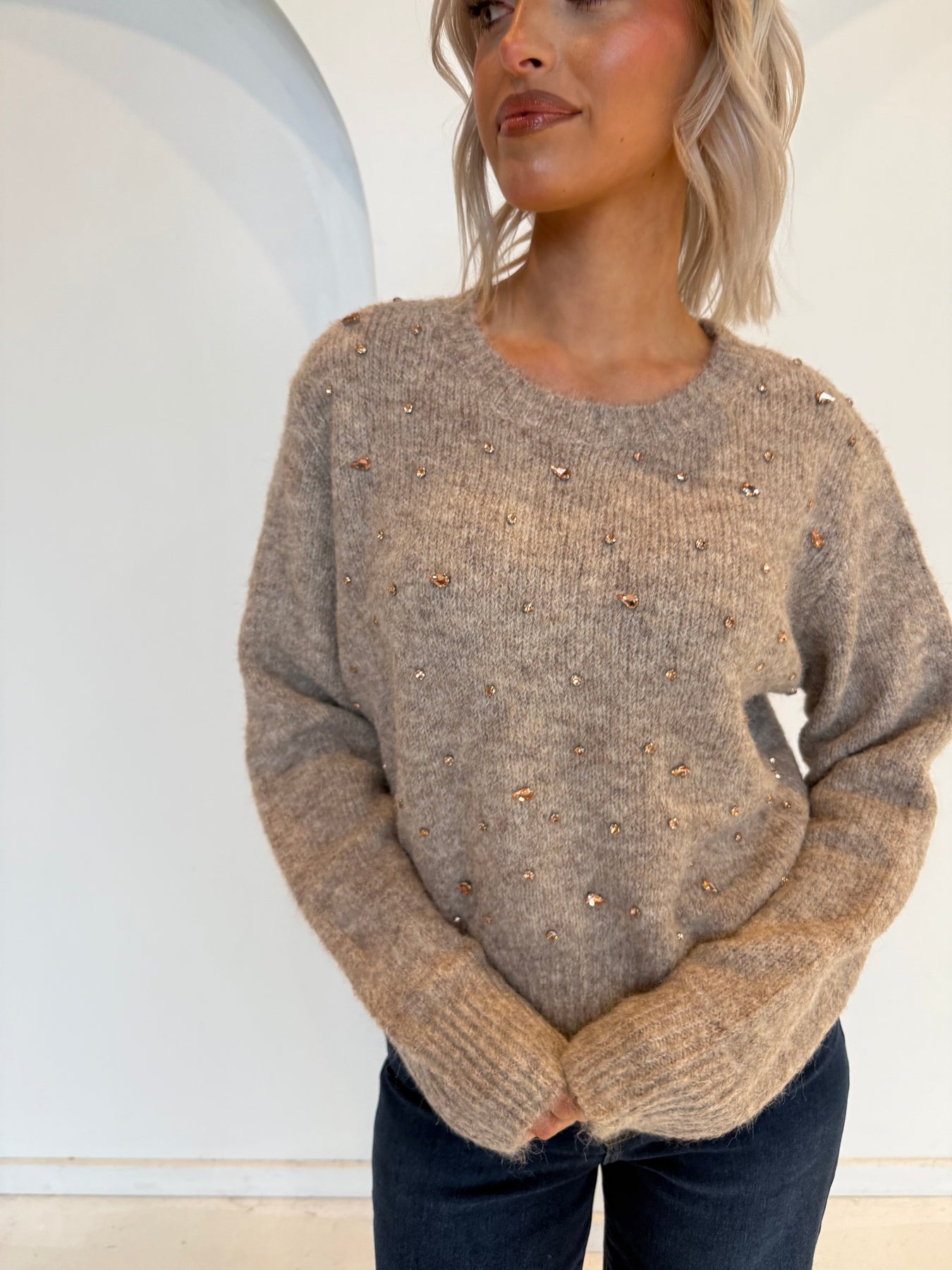 Soft, sparkly, and effortlessly chic — the Eve Embellished Sweater is made for cozy holiday moments. Crafted from a plush knit in a warm taupe hue, it features delicate crystal embellishments scattered throughout for a subtle festive shimmer. With its relaxed fit and ribbed trim, it’s perfect for pairing with denim for an elevated everyday look or dressing up for a night under the lights.
