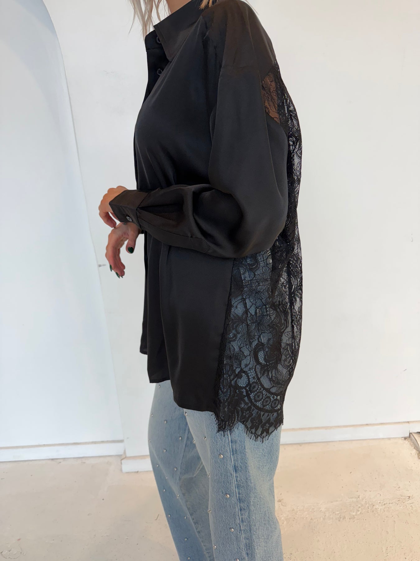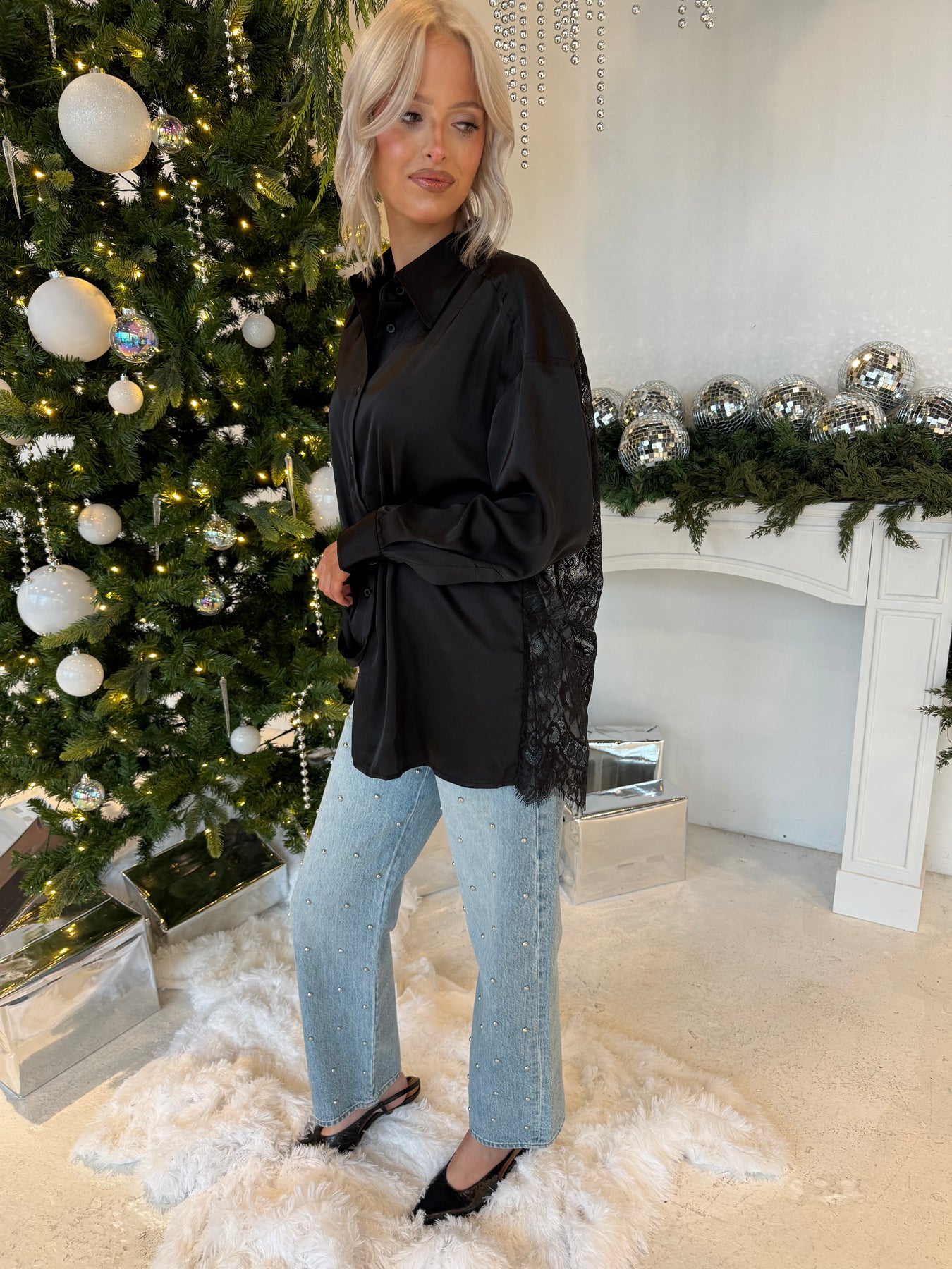 Meet your new statement top — the Lace Back Satin Blouse. Crafted from smooth, lustrous satin with a relaxed silhouette, this blouse features a stunning lace back panel that adds a touch of romance to its modern edge. The button-front design and cuffed sleeves give it a polished feel, while the intricate lace detailing brings effortless sophistication.
