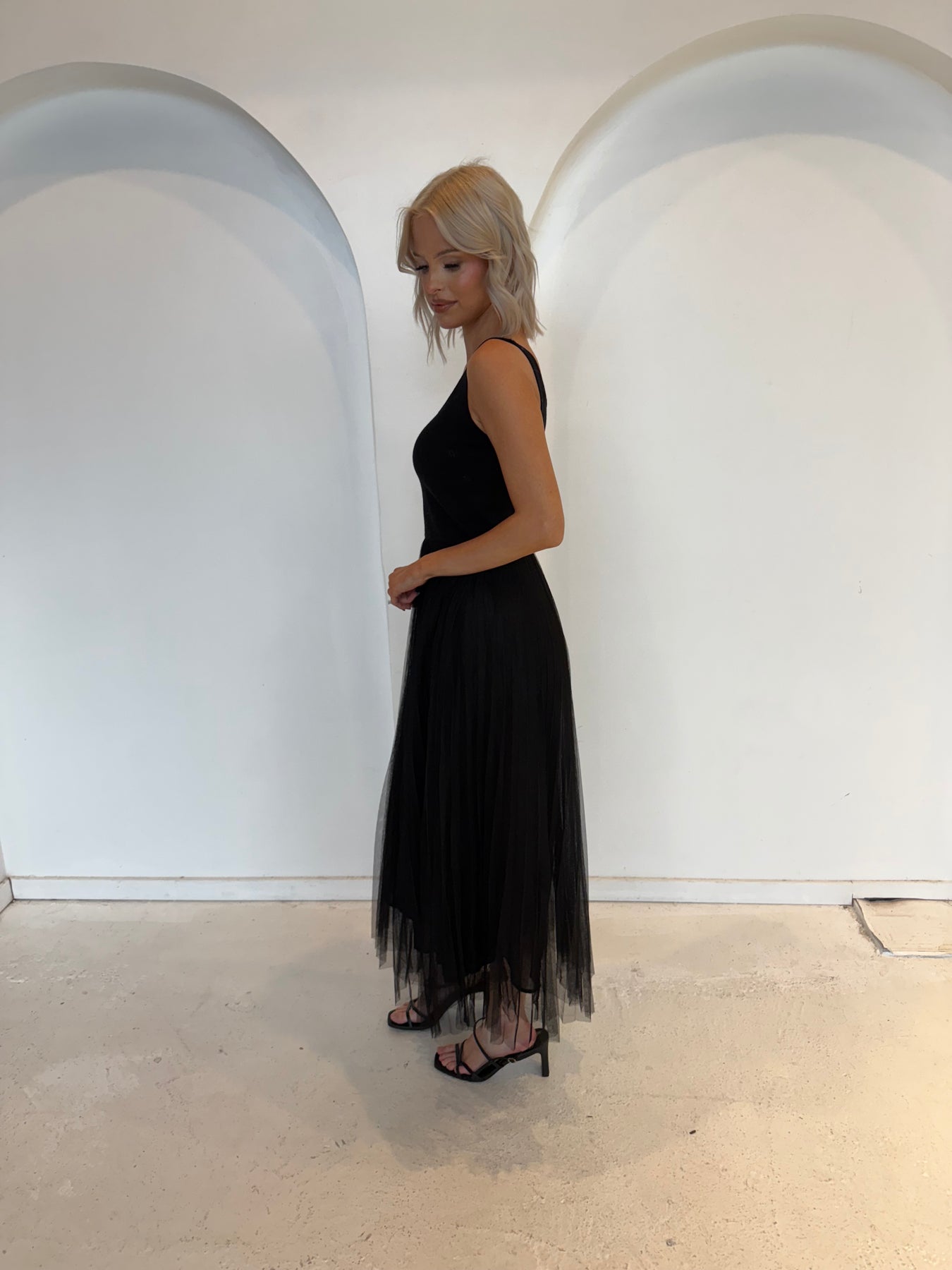 Elegant, timeless, and effortlessly chic — the Midnight Tulle Dress is made for every holiday soirée and special occasion. Featuring a fitted knit bodice that flatters the shape and a flowy layered tulle skirt that adds just the right amount of drama, this dress combines comfort with sophistication.
