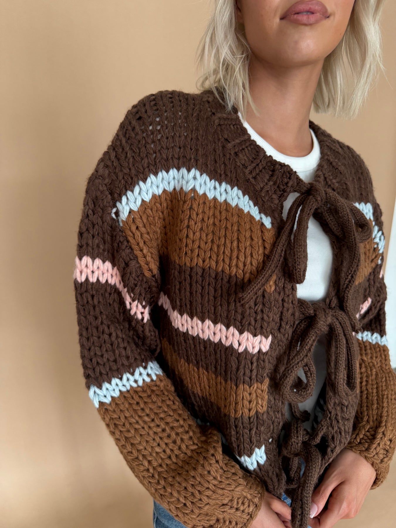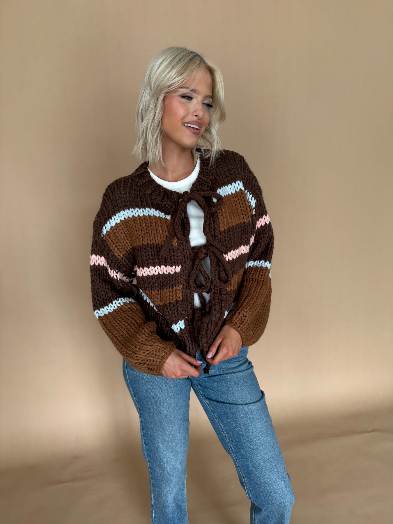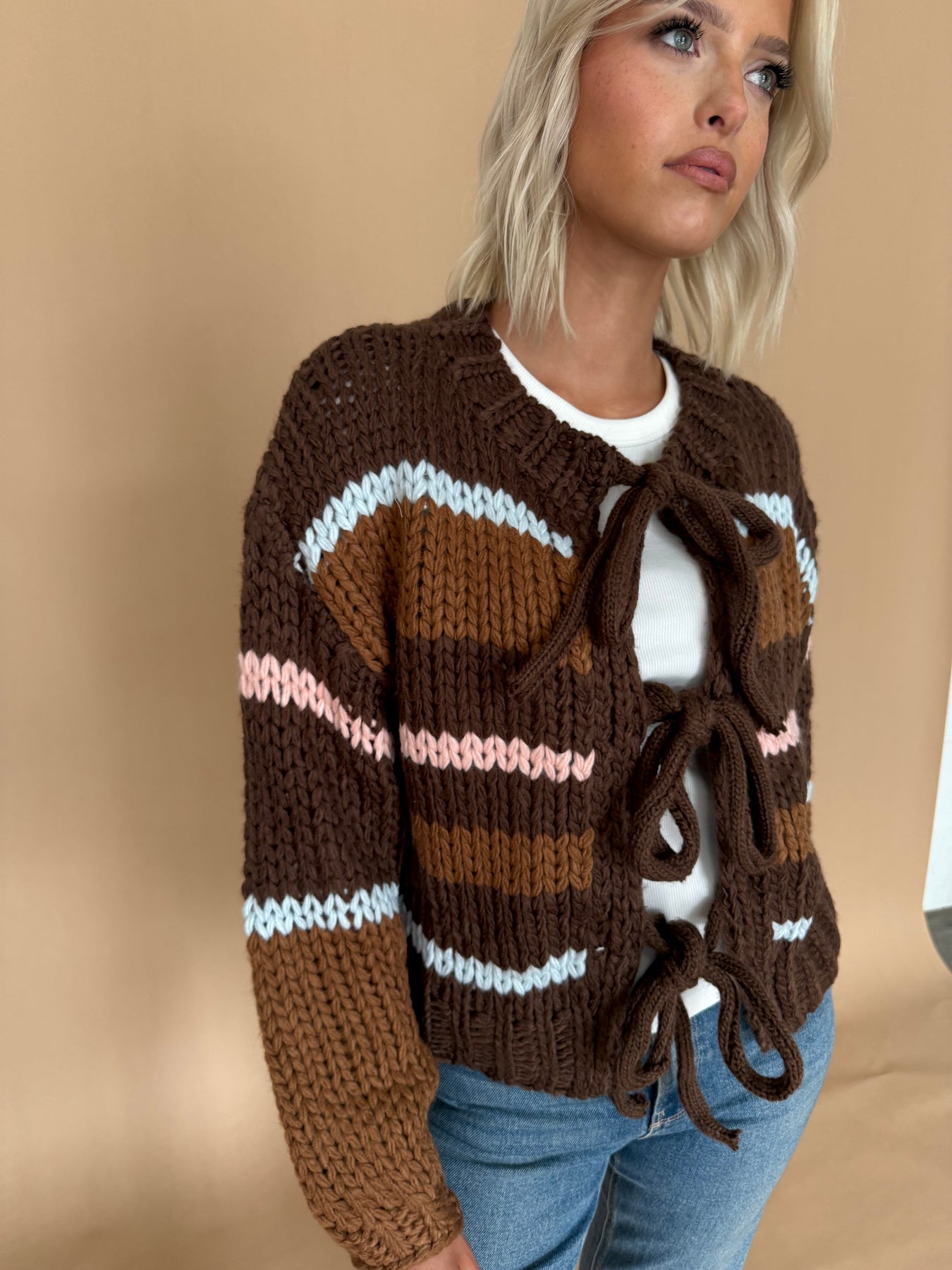 Playful and cozy, The Maren Tie-Front Cardigan adds a fun pop of texture to your fall lineup. Featuring chunky knit stripes in warm mocha and soft pastel tones, this cardigan stands out with its unique tie-front closure and relaxed, boxy fit. Perfect for layering over tees or dresses for that effortlessly styled, “just threw it on” look.