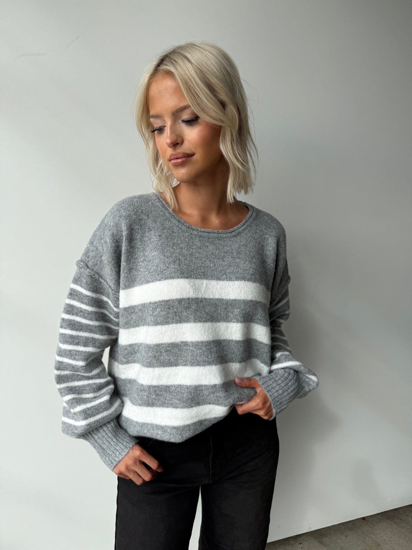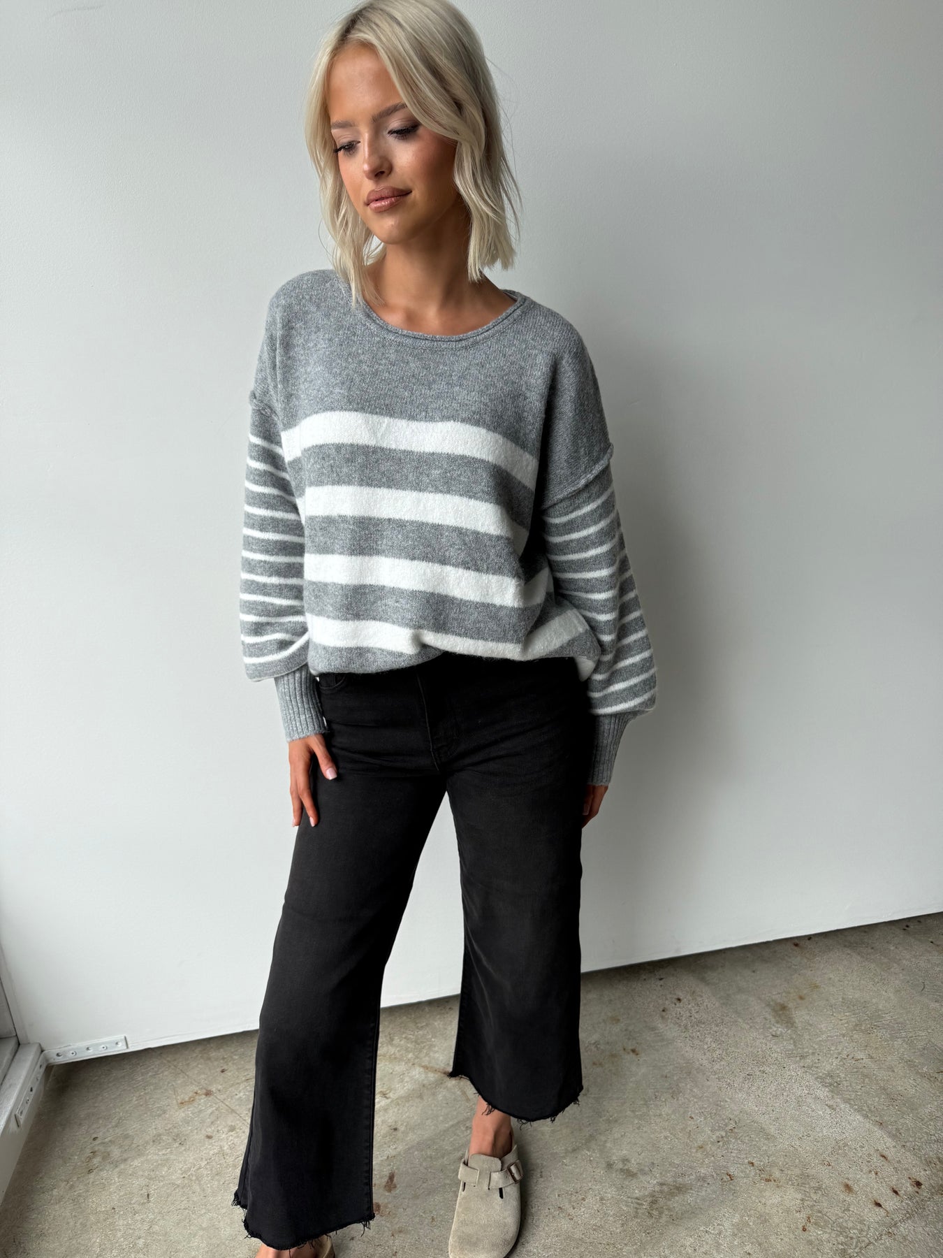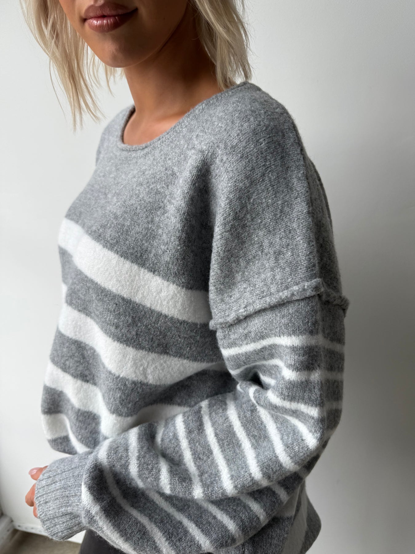 The definition of effortless comfort. The Madison Stripe Sweater features soft, brushed knit fabric with wide grey and ivory stripes and a relaxed, slightly boxy fit. Dropped shoulders and subtle seam detailing add a modern touch to this timeless favorite. Pair it with denim or layer it over a slip skirt for that laid-back, polished feel.