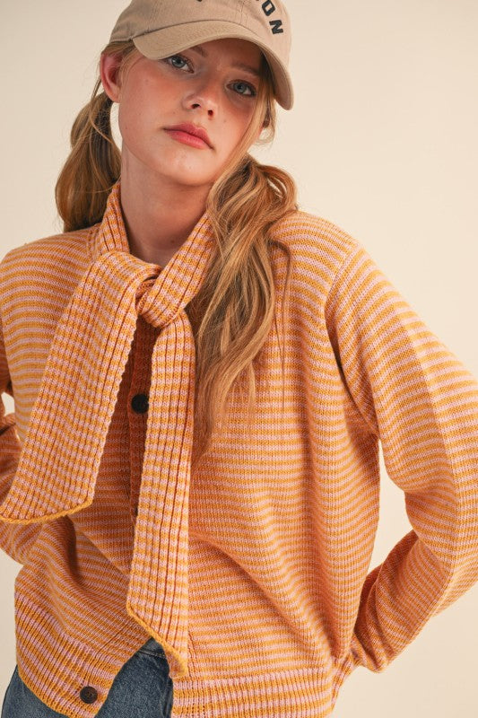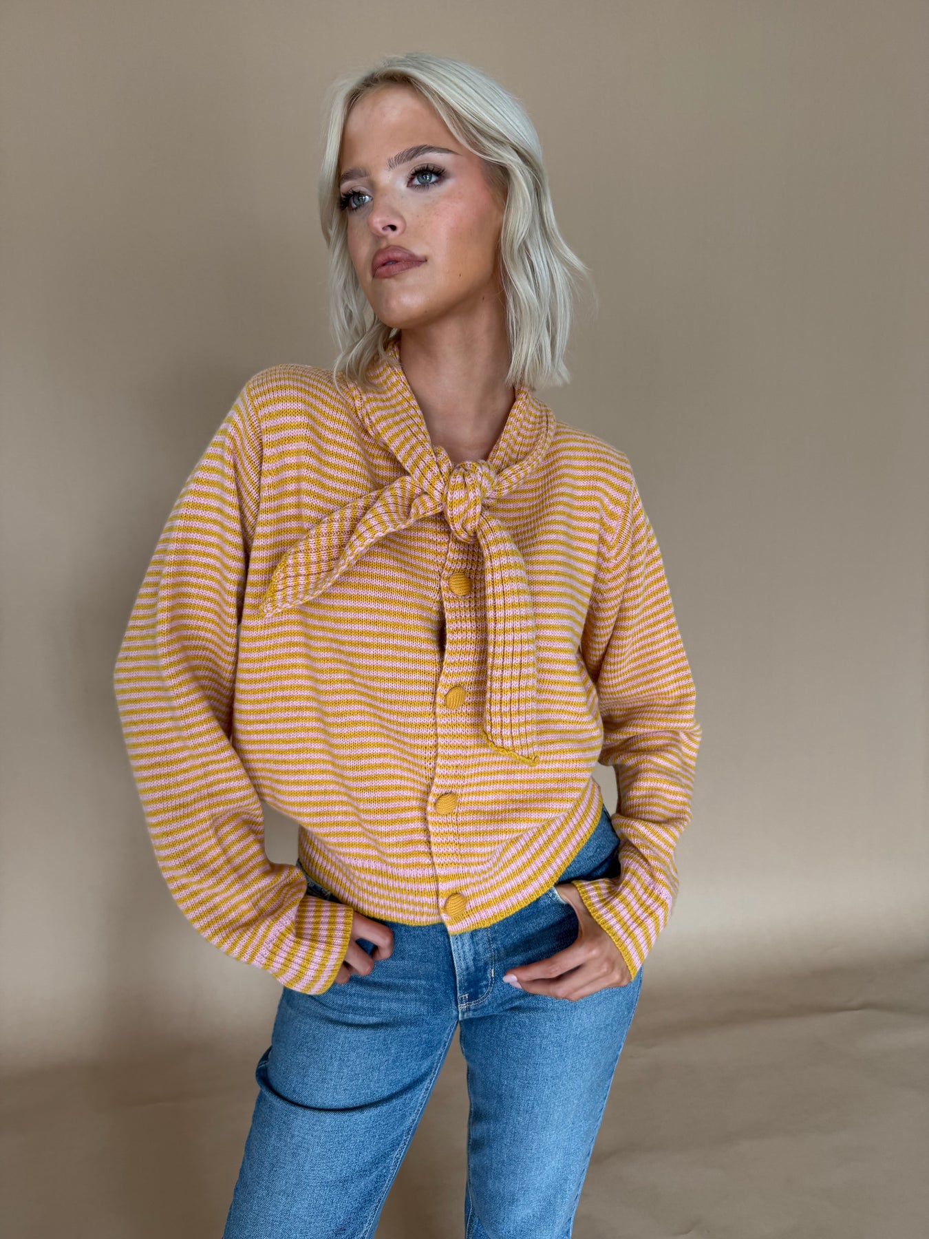 Bright, playful, and effortlessly chic — The Cosette Striped Tie Cardigan adds a pop of sunshine to your fall wardrobe. Featuring soft yellow and white stripes, a feminine tie neckline, and button-front closure, this piece blends classic charm with modern style. Pair it with denim or layer it over a dress for an easy, polished look that feels fresh and fun.