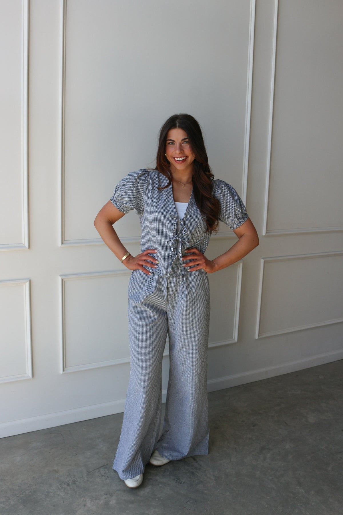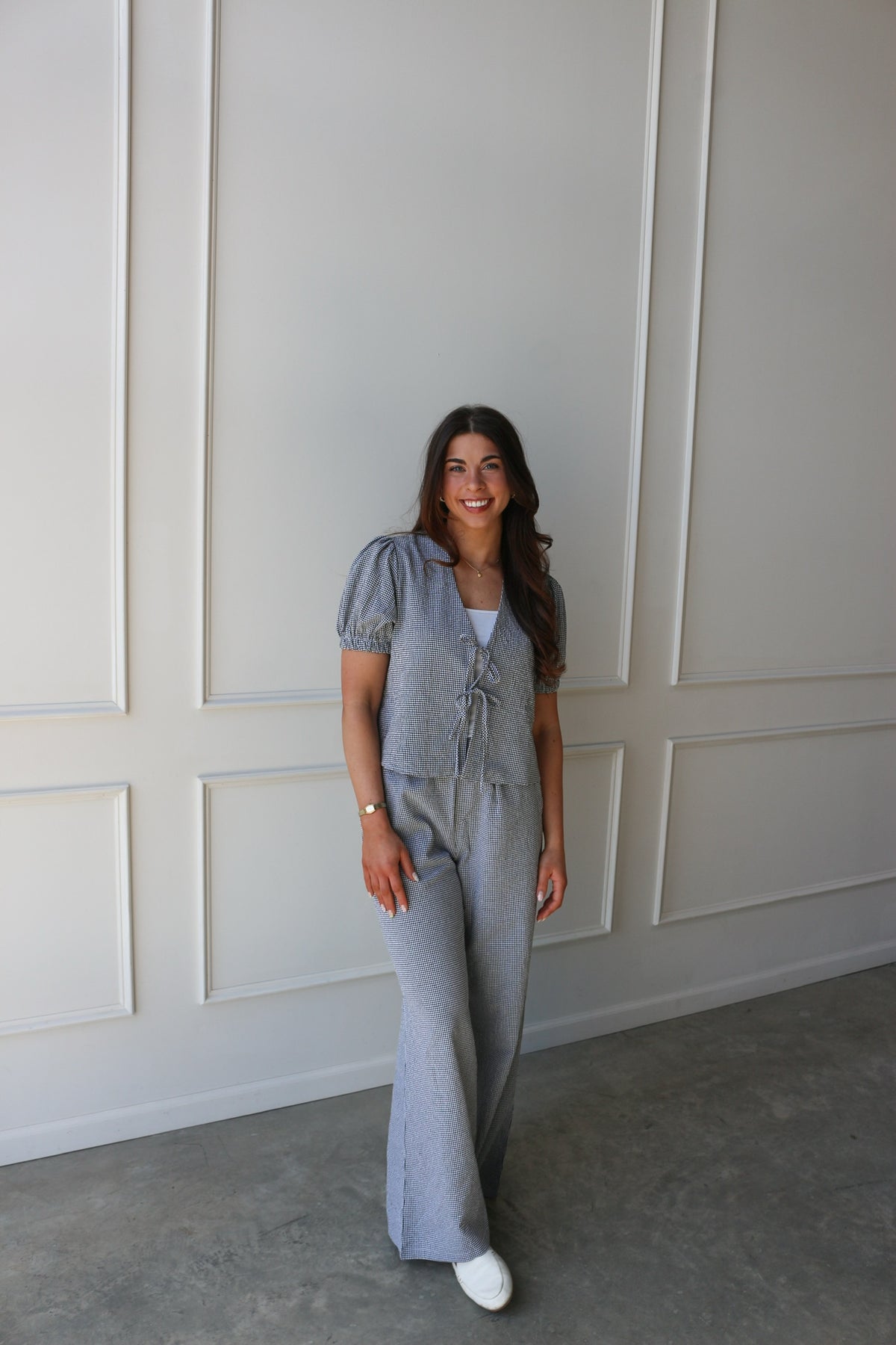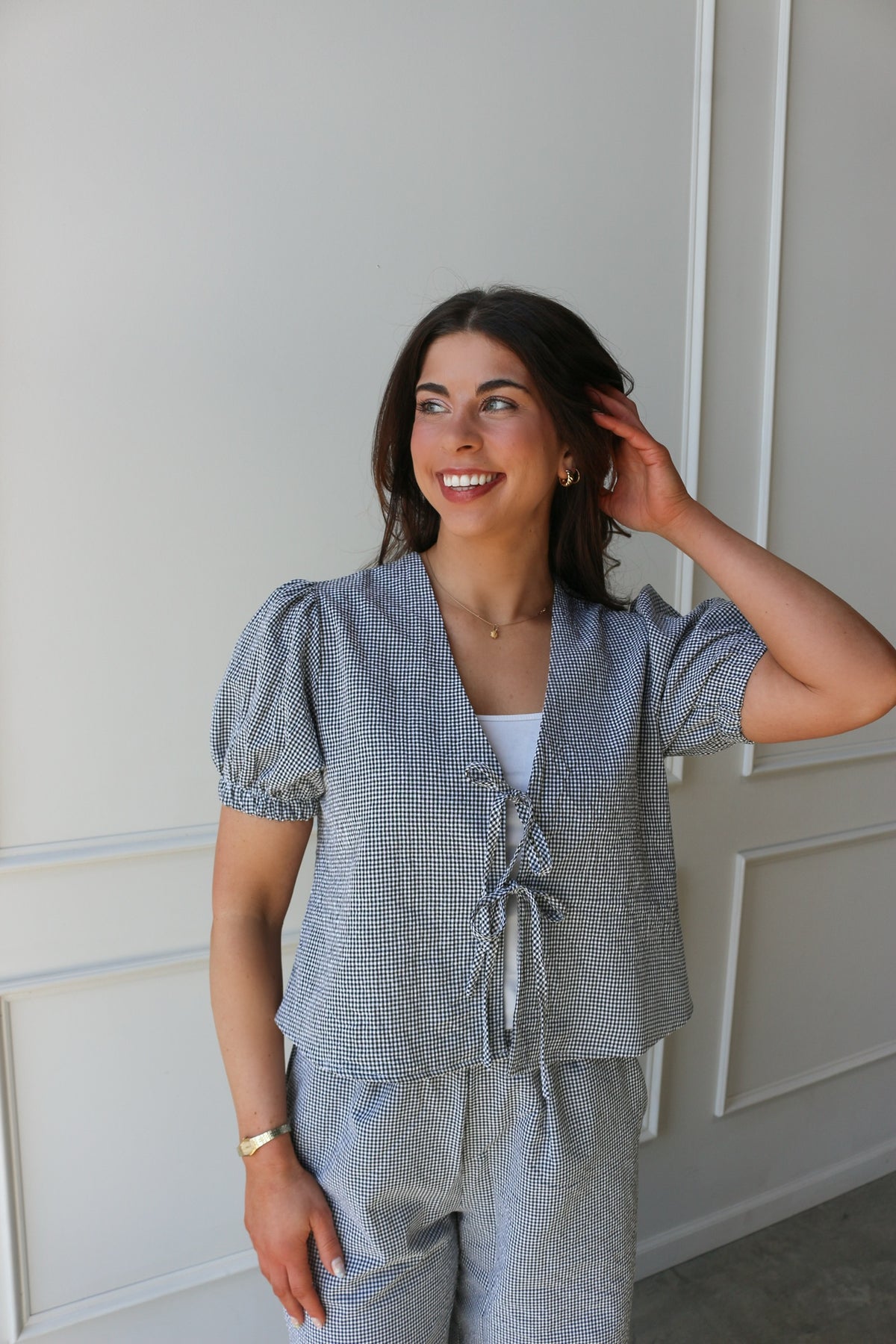 A lightweight, feminine layer with a playful touch. Featuring a subtle gingham print, puff sleeves, and a tie-front detail, this top is perfect for pairing with denim or the matching bottoms for a coordinated set.
