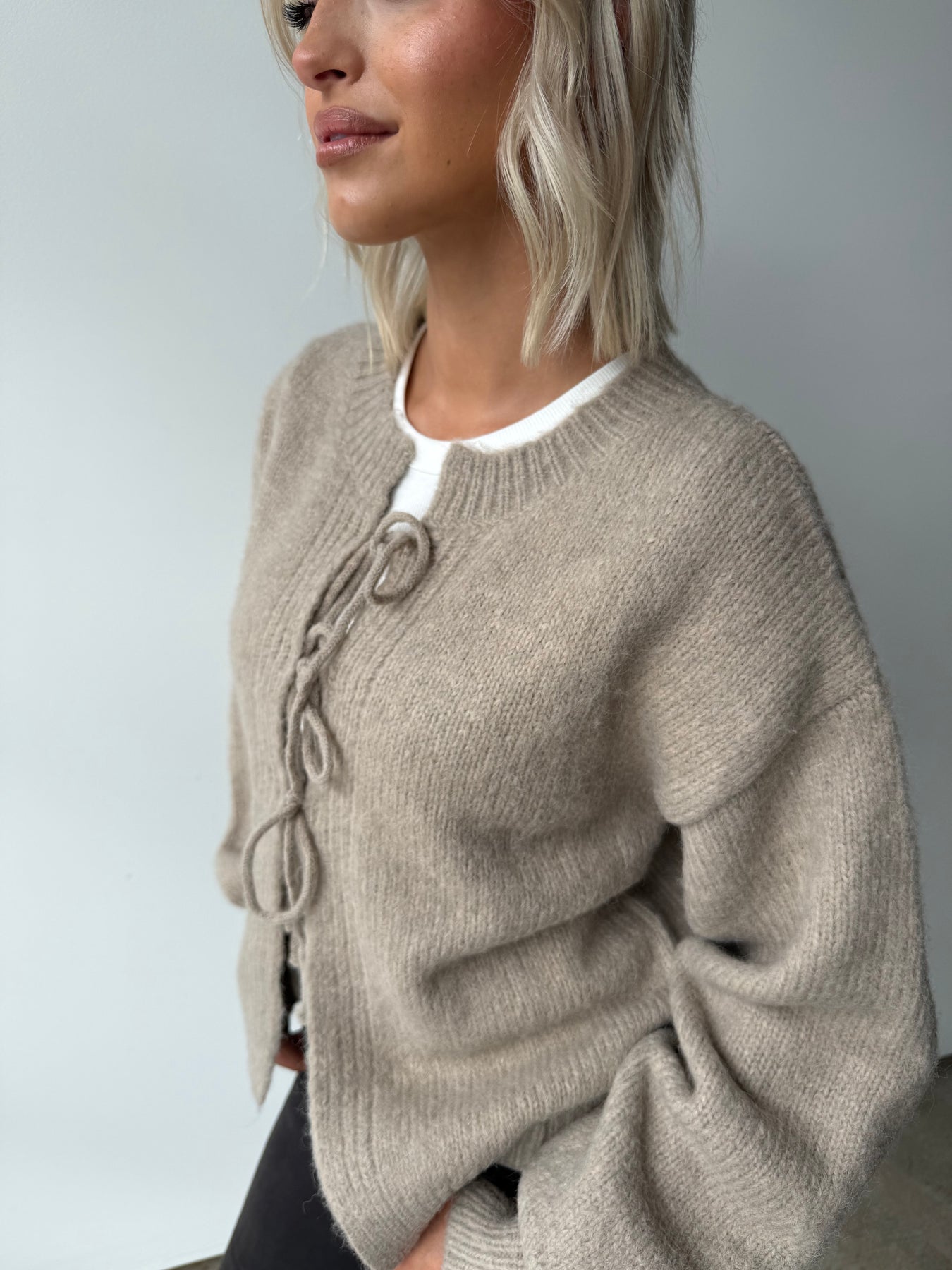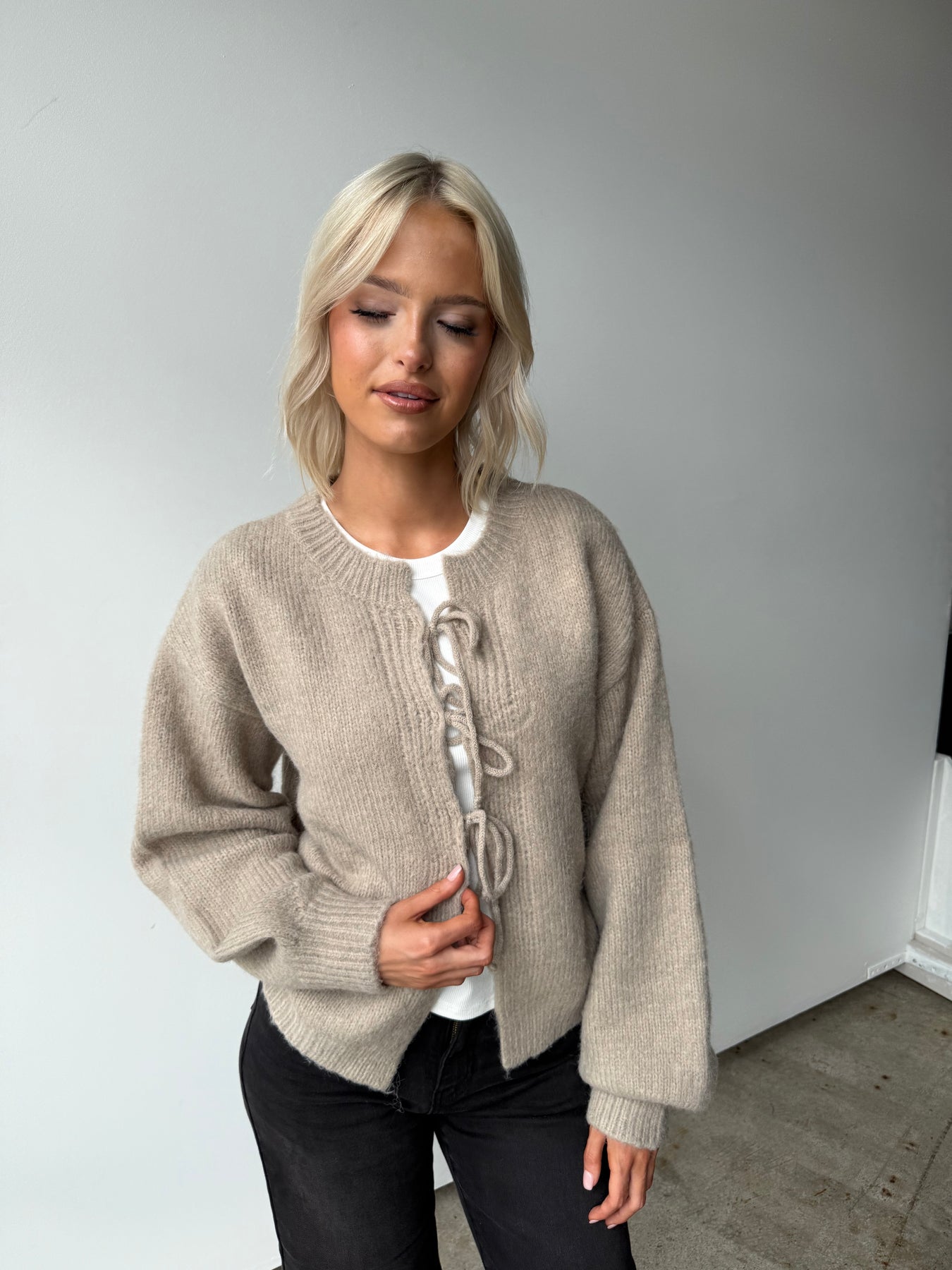 Soft, effortless, and subtly romantic — The Amelie Tie Cardigan brings a touch of texture to your everyday layers. Designed with a plush knit feel, balloon sleeves, and a tie-front closure for an undone-but-intentional look. Style it open over a tank or tied over your favorite denim for that easy-chic balance we love.
