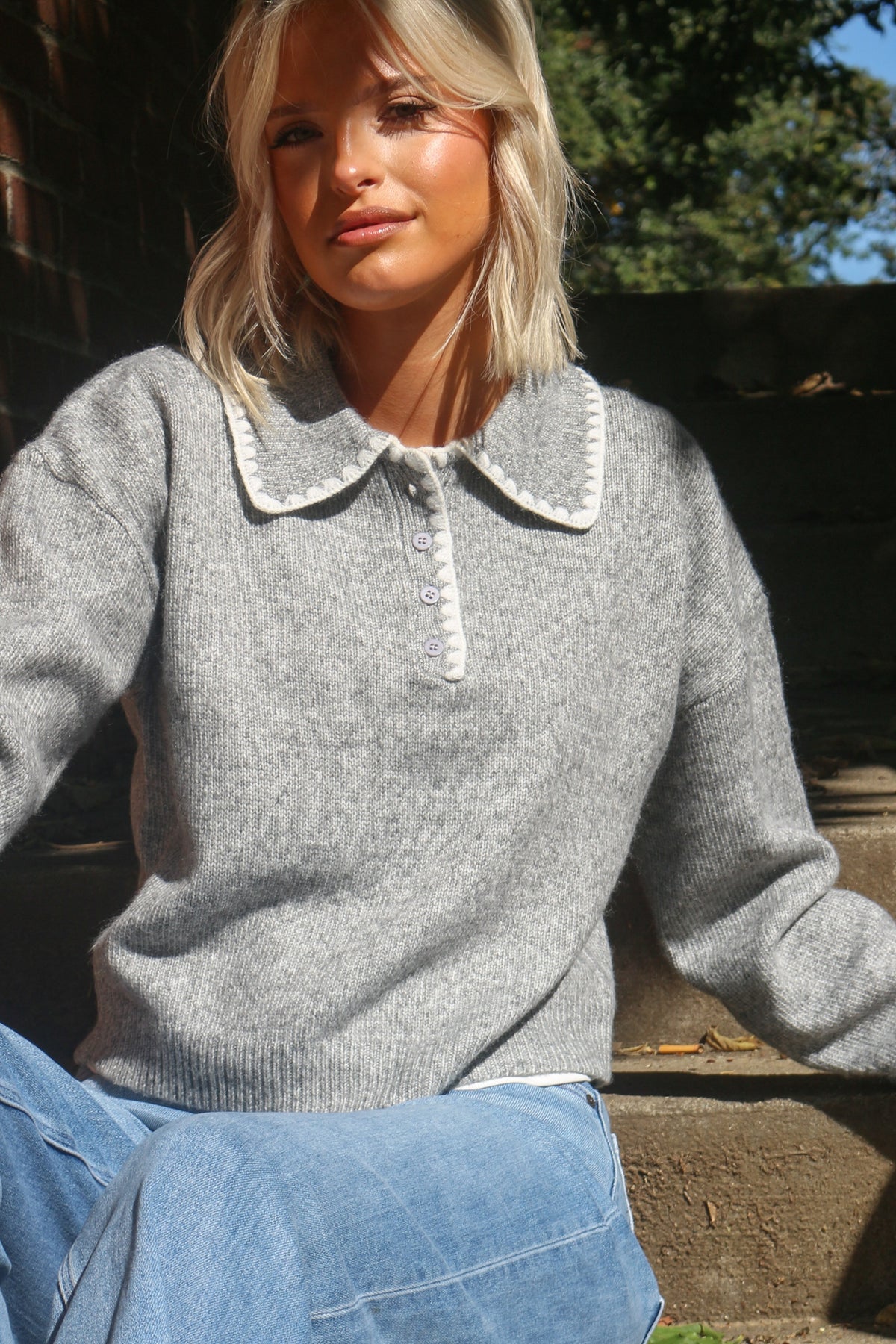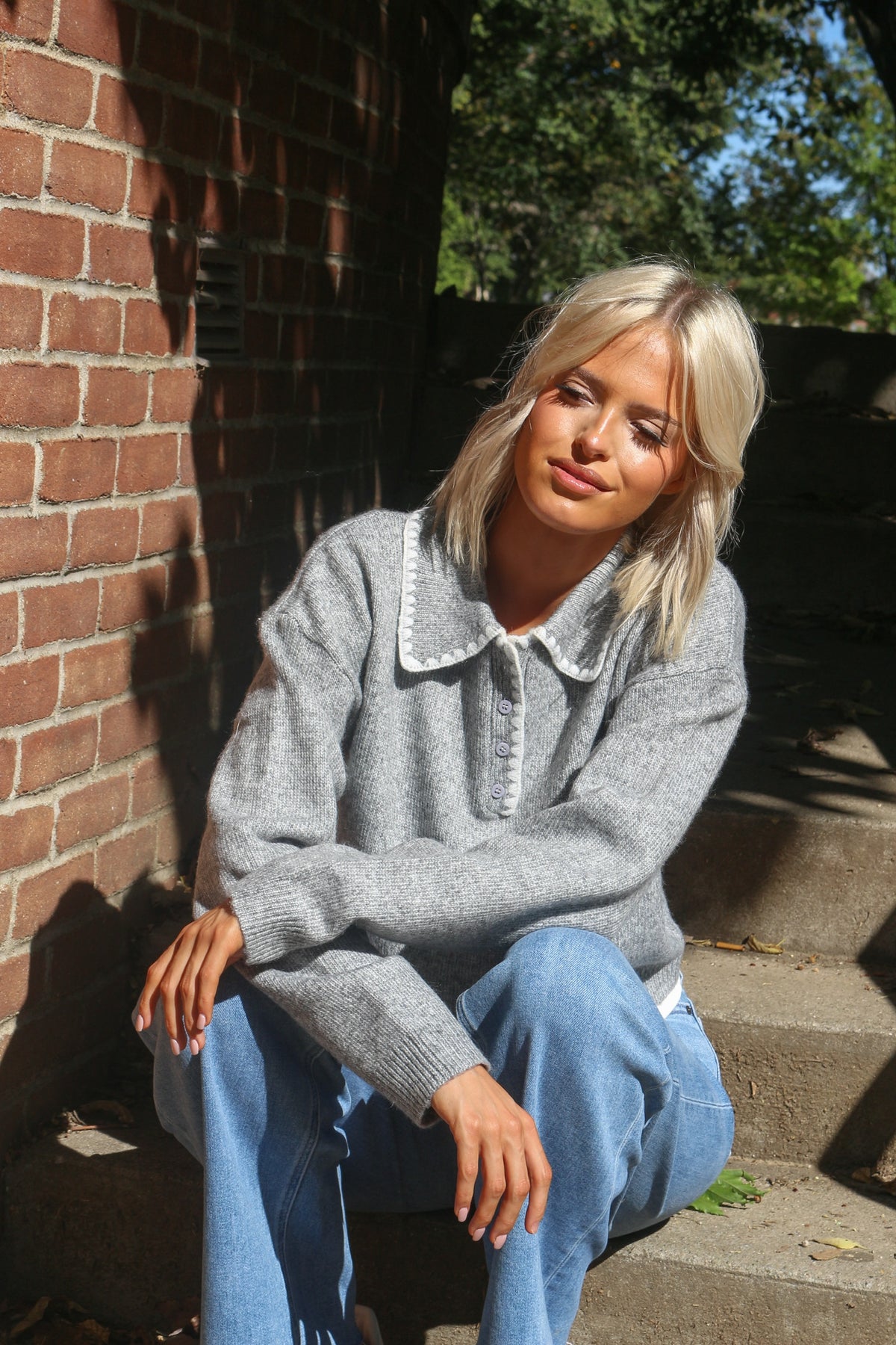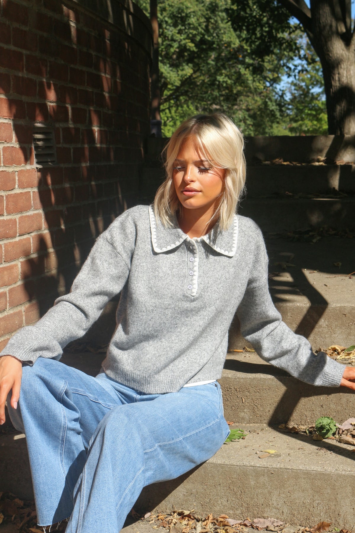 A feminine twist on a classic knit. This collared sweater features a soft heather grey yarn, subtle button neckline, and delicate scallop trim for a touch of charm. Cozy meets elevated—pair with denim, trousers, or layered under a coat for that chic fall look.