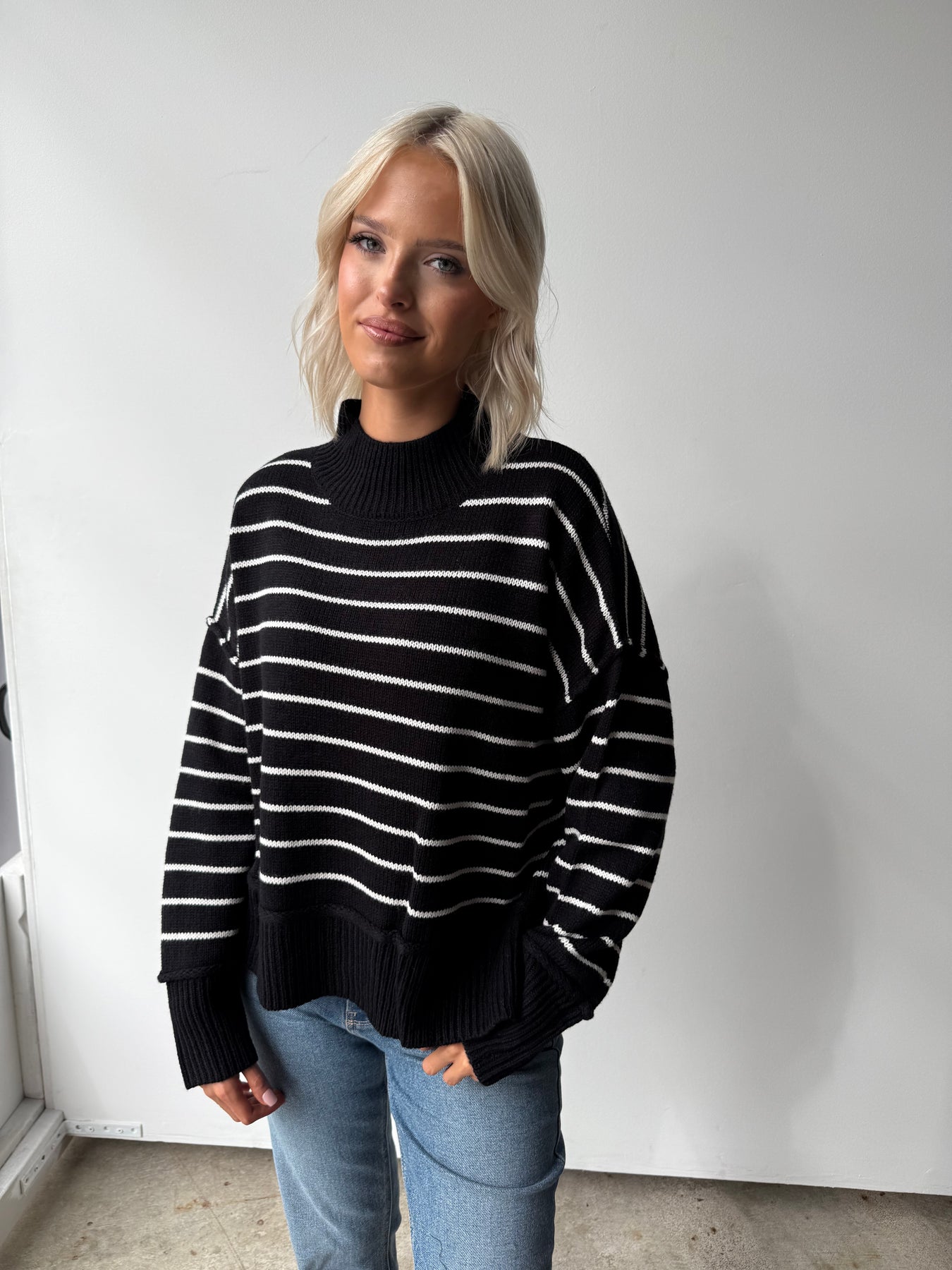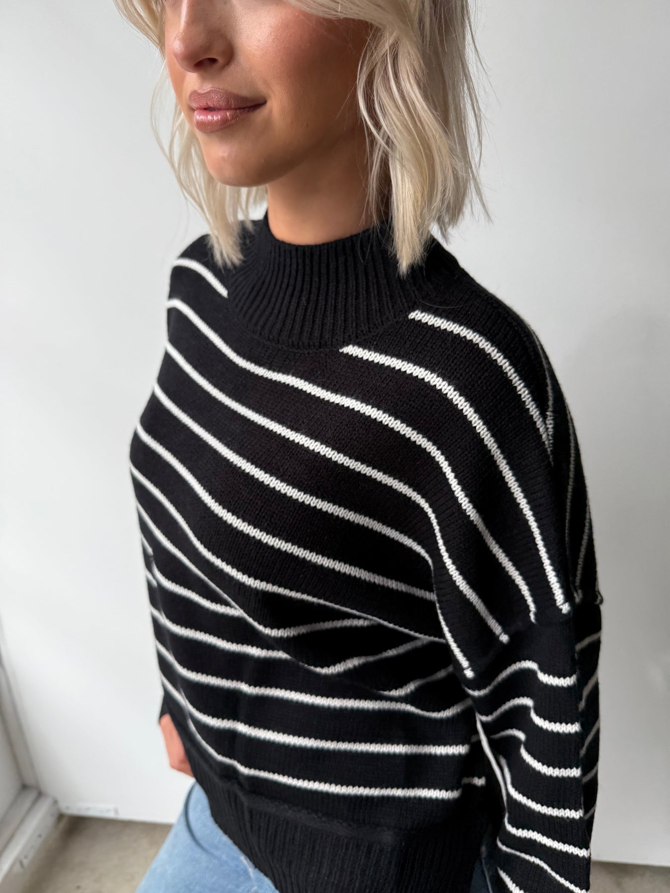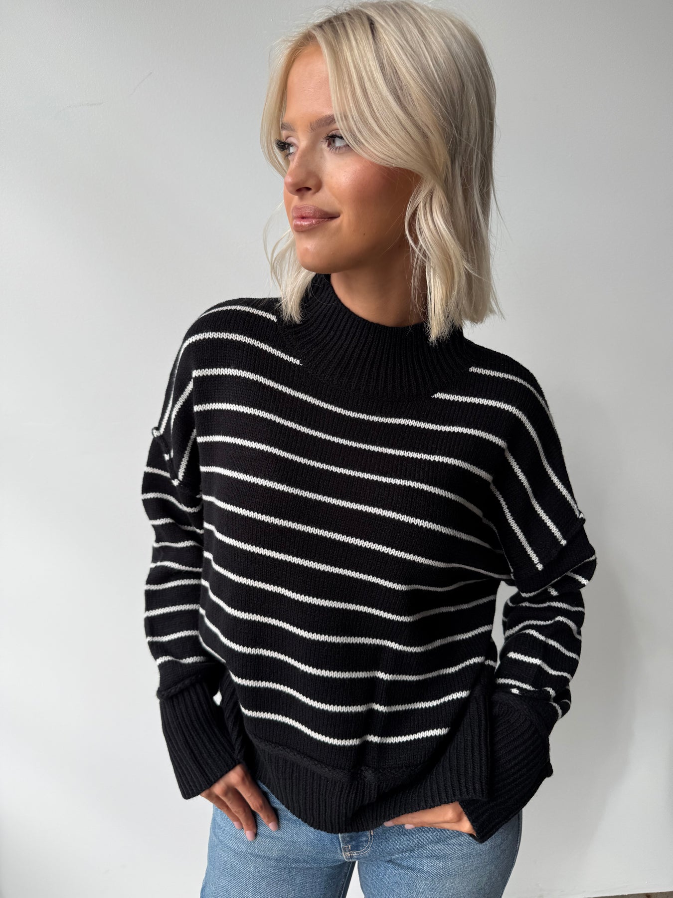 An instant classic with a relaxed edge — The Margot Striped Sweater is that effortlessly cool knit you’ll keep reaching for. Designed with soft horizontal stripes, a cozy mock neck, and ribbed trim, it’s the perfect mix of timeless and laid-back. Pair it with denim for an easy everyday look or layer it over a crisp button-down for a touch of polish.
