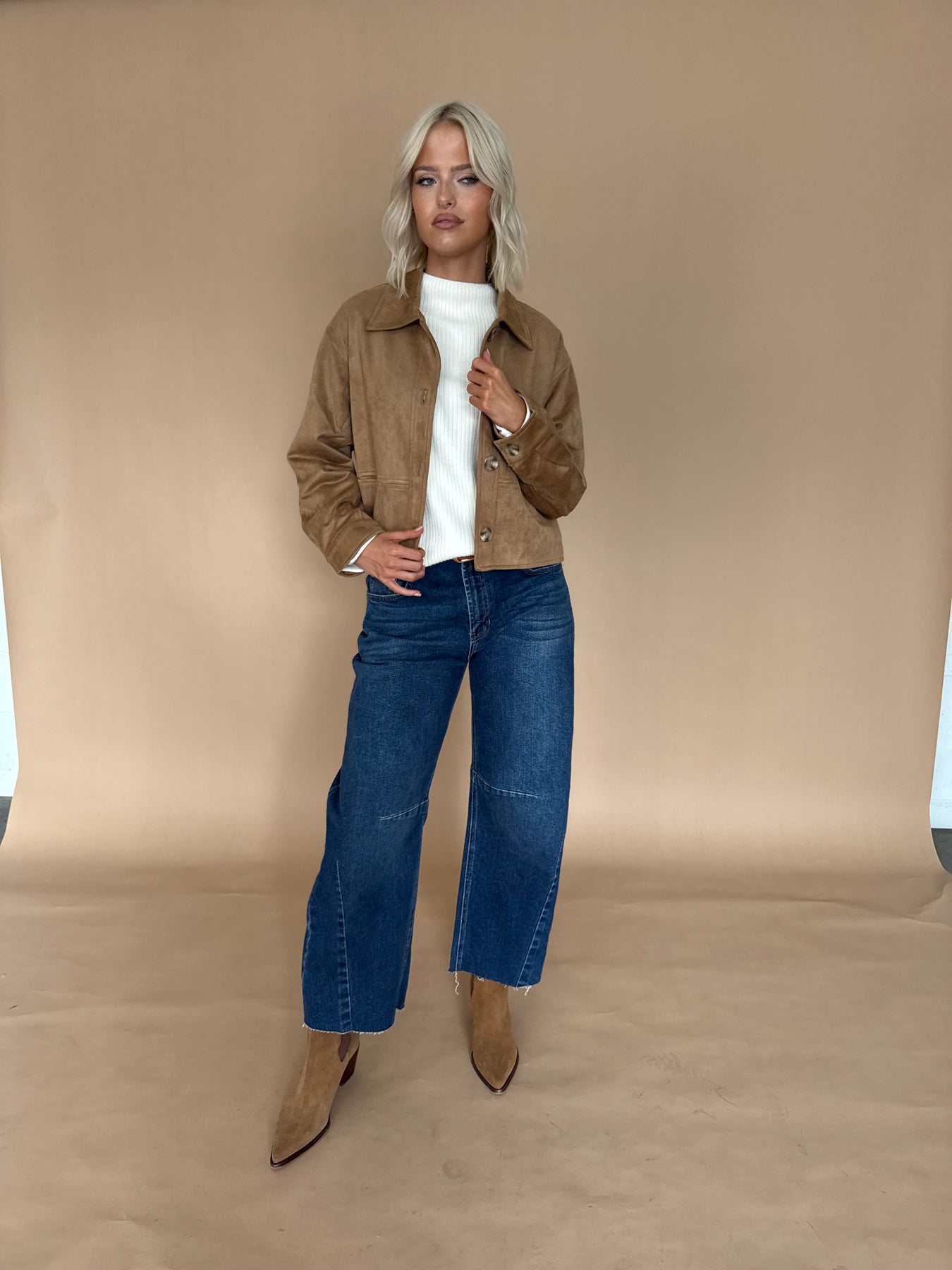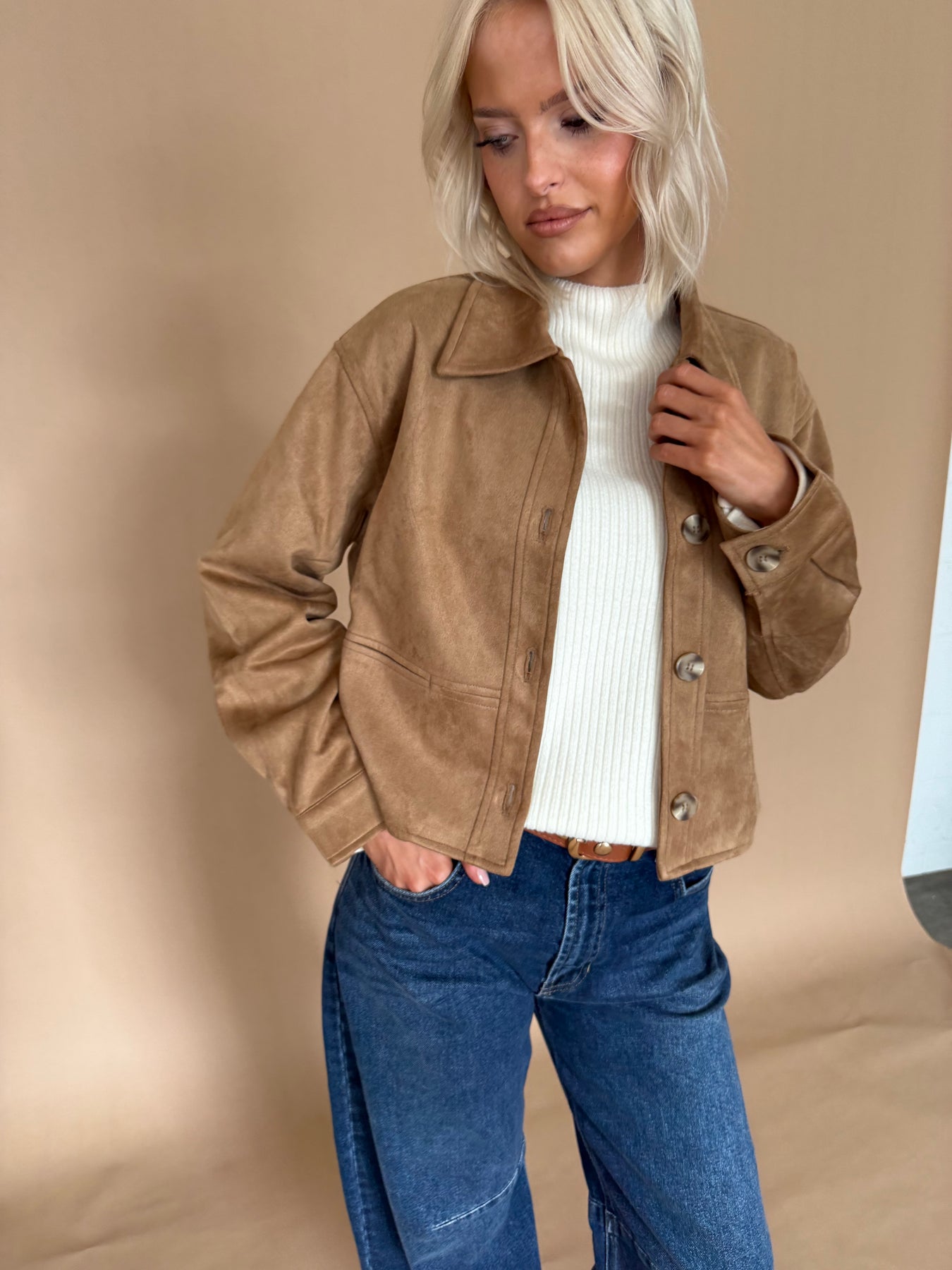 Meet your new fall favorite. The Sandra Suede Jacket blends timeless structure with a soft, lived-in feel. Crafted from a luxe faux-suede fabric, this button-front layer features an easy, boxy fit, classic collar, and front pockets for a touch of utility. Its neutral camel tone makes it endlessly versatile—pair it with denim, knits, or over dresses for effortless, polished style all season long.