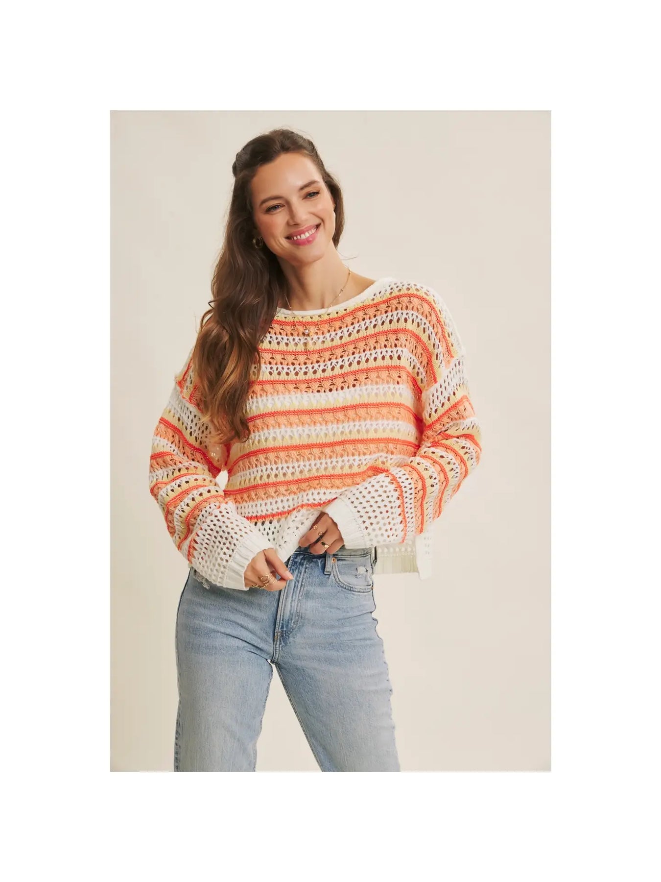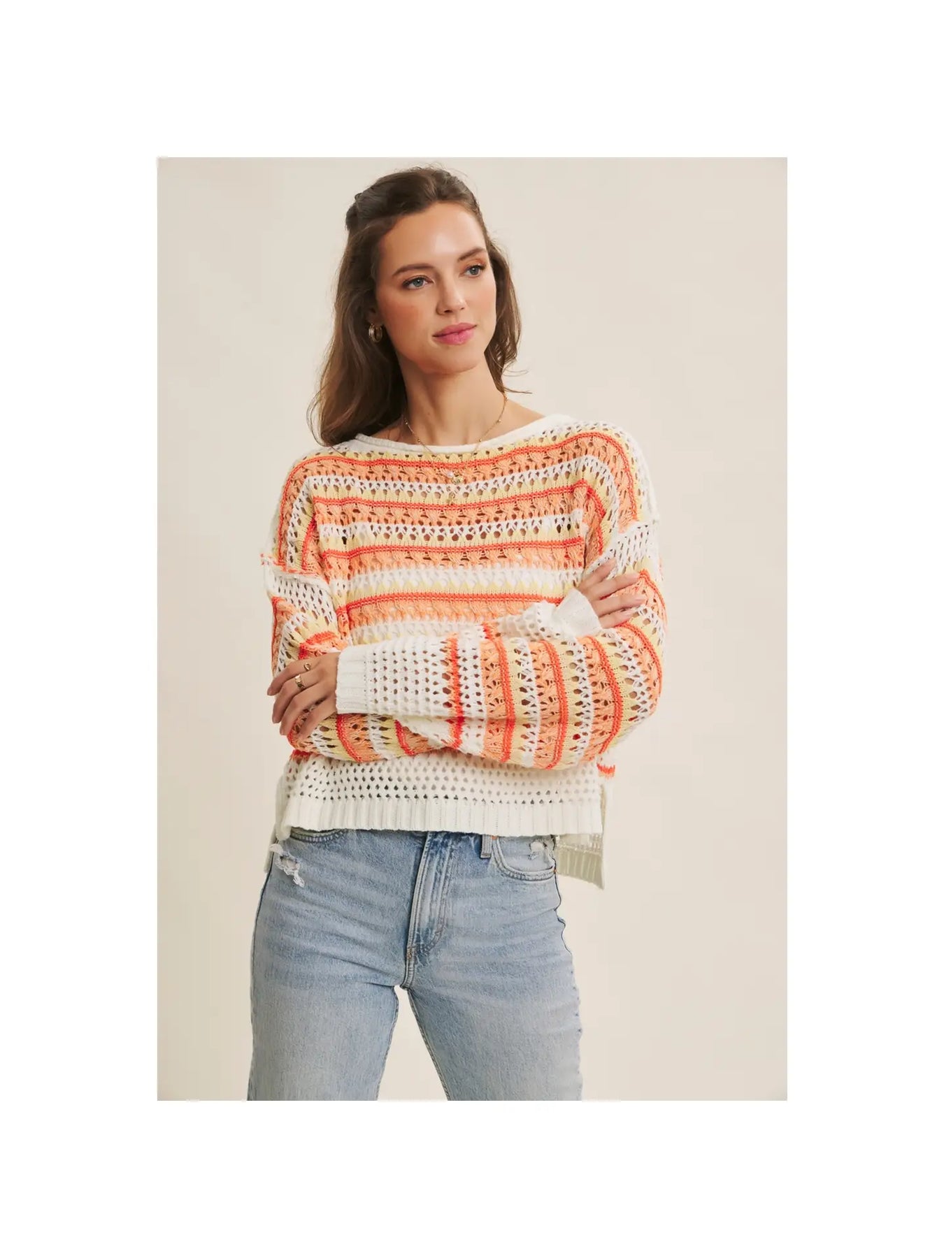 Bright, cozy, and effortlessly chic. This crochet sweater is your go-to for that easy transitional look. Featuring vibrant multi-color stripes in a soft open-knit texture, it adds a warm yet breathable layer to any outfit. The relaxed, oversized fit drapes beautifully, while the boat neckline and subtle side slits make it perfect for pairing with jeans or over dresses. Whether you’re heading to brunch, the beach, or a sunset stroll, this piece brings a playful pop of color and laid-back charm to your everyday wardrobe.