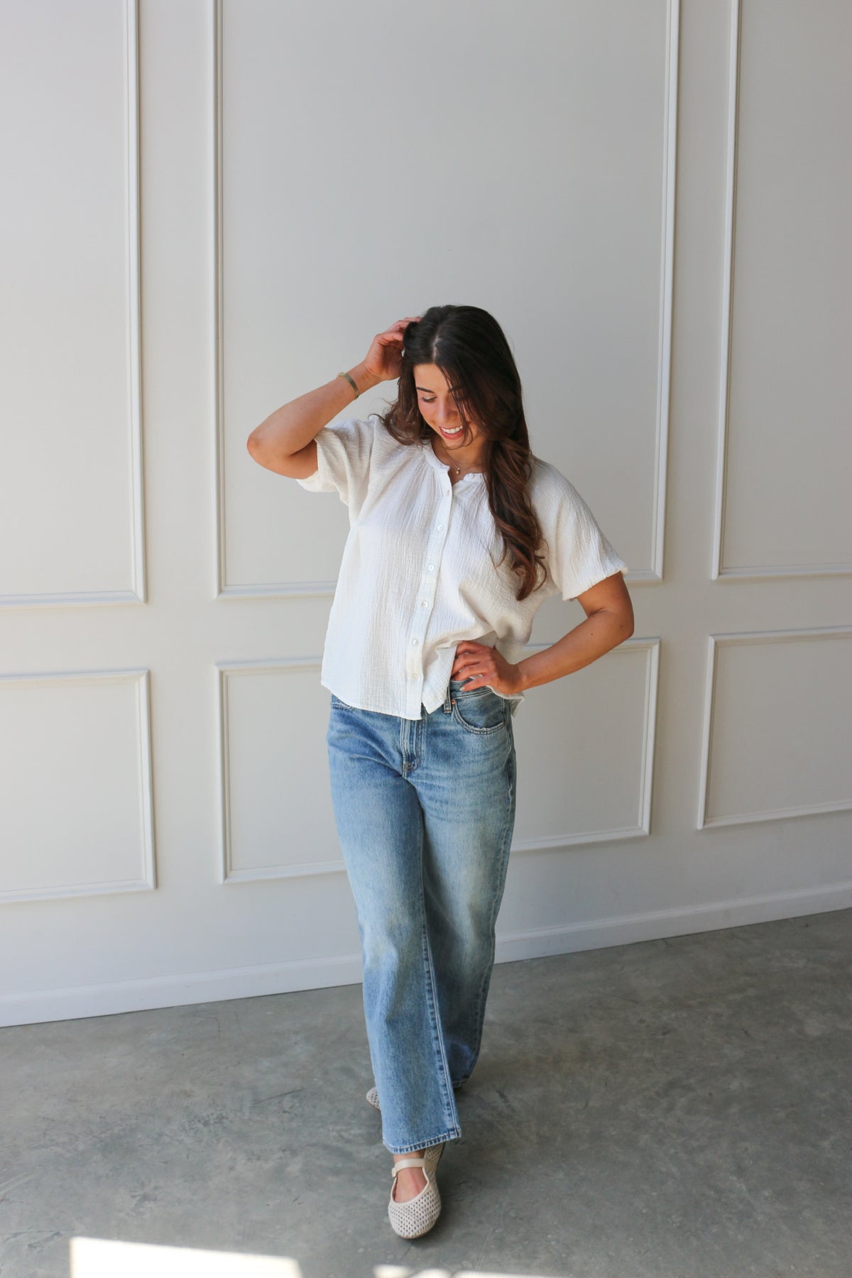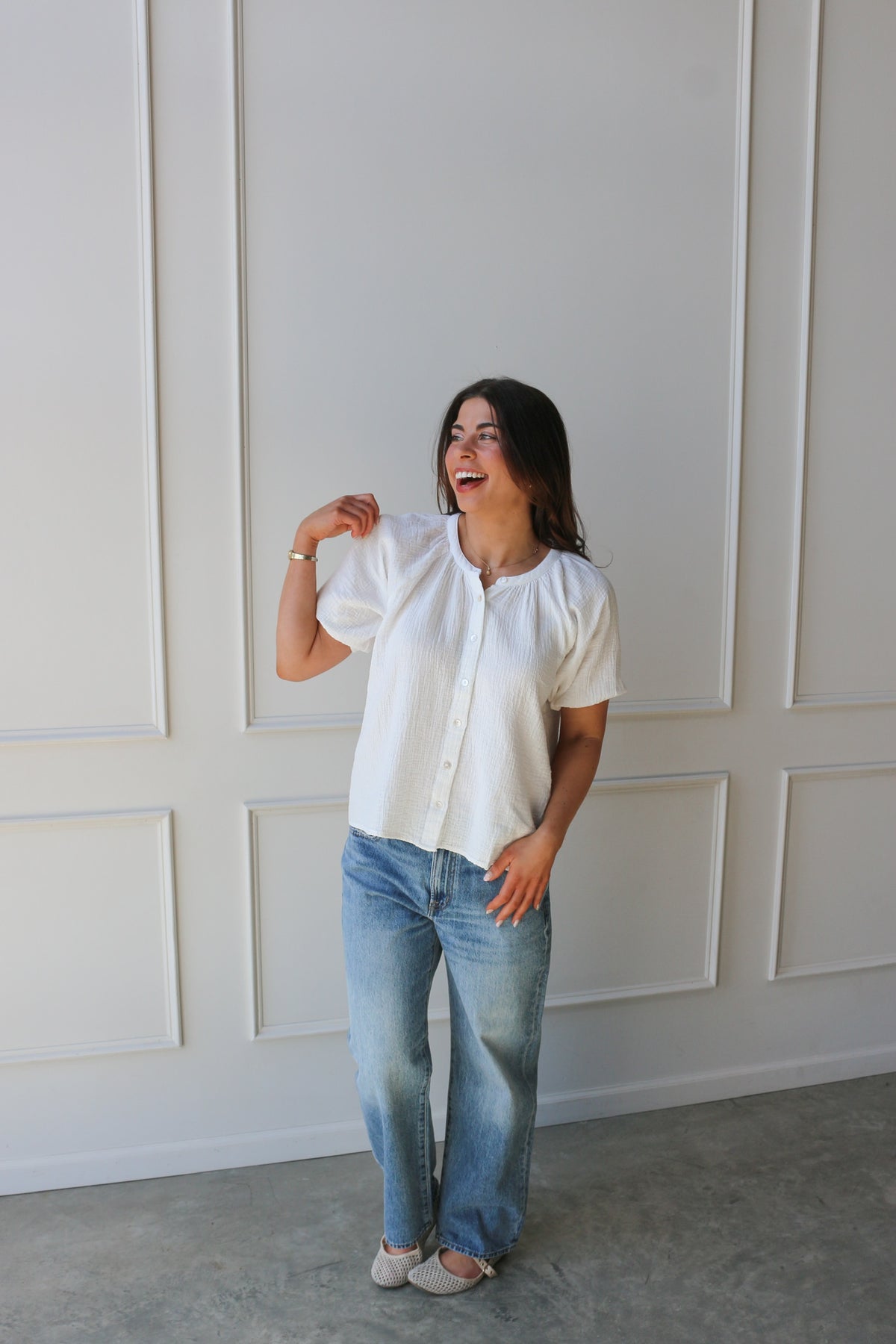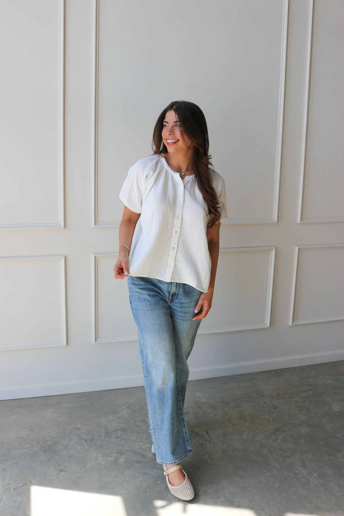 An easy, everyday essential. This breezy blouse features a relaxed fit, soft texture, and button-front detail for effortless styling. Perfect tucked or worn loose with your favorite denim.